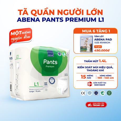 Tã quần người lớn Abena Pants Premium L1 thấm hút 1.400ml - Nhập khẩu Đan Mạch (Gói 15 miếng)