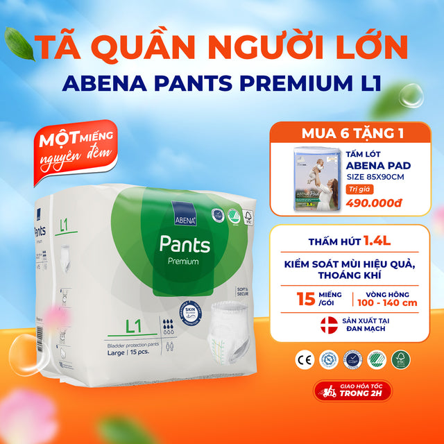 Tã quần người lớn Abena Pants Premium L1 thấm hút 1.400ml - Nhập khẩu Đan Mạch (Gói 15 miếng) - Gói 2 Đặt hàng trước, sẽ giao ngay khi có hàng.